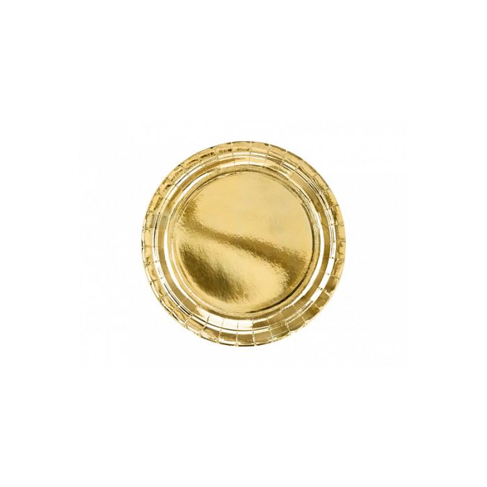x 6 assiettes rondes métallisées de couleur or, en carton, mesurant 23 cm.