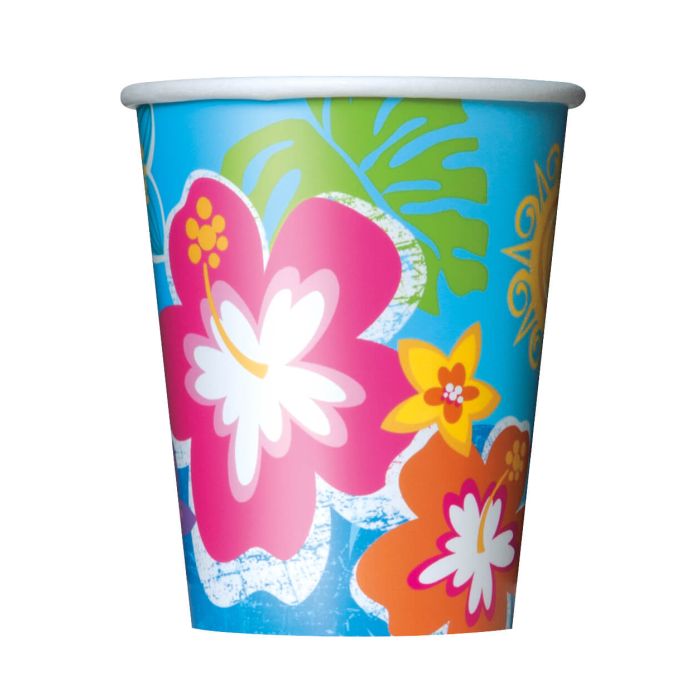 Complétez votre table avec ces 8 Gobelets Hula Beach Party de 270 ml en carton. Ces gobelets sont décorées de fleurs et de feuilles de palmiers sur fond bleu.