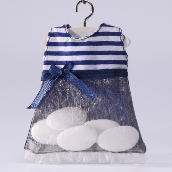 Ces pochettes à dragées toute mignonne seront les contenants parfaits à offrir à vos invités lors d'un baptême ou d'une naissance. La robe marinière avec le petit noeud en satin marine est du plus bel effet.
