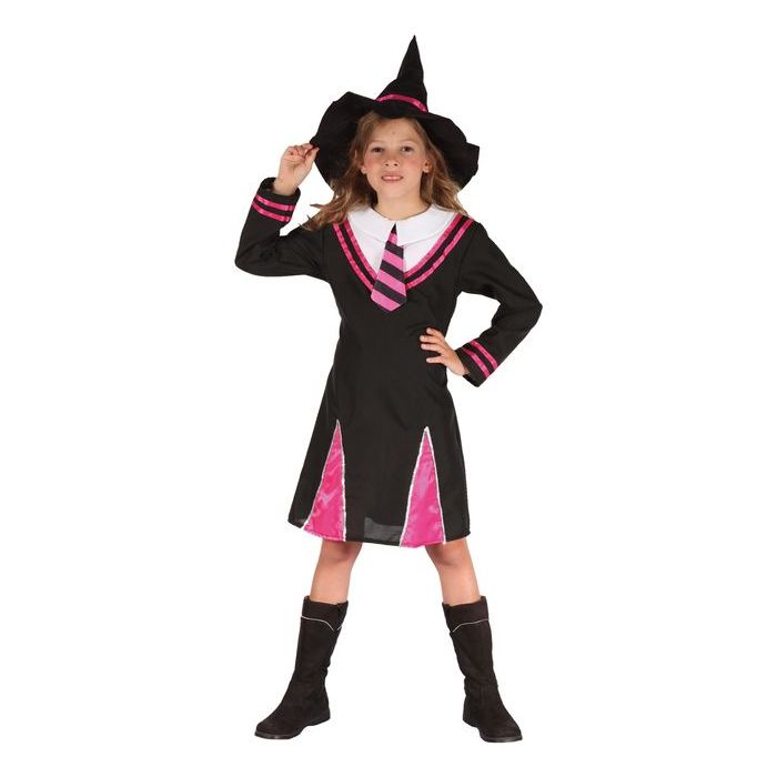 Déguisement fille sorcière luxe - noir et rose, en taille 7/9 ans. Il inclut la robe avec cravate et le chapeau.