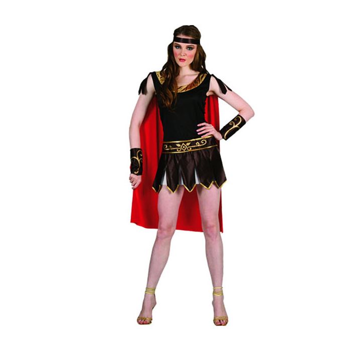 Il s'agit d'un déguisement de romaine, pour femme, comprenant une tunique cuirasse agrémentée d'une cape rouge et d'une ceinture marron avec des motifs dorés. Un bandeau pour les cheveux et une paire de mitaines assorties à la ceinture, viennent parfaire la tenue de romaine. Les autres accessoires ne sont pas inclus.