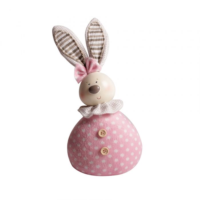 Nous vous proposons ce joli lapin en tissu rose pour compléter une décoration de table. Le corps du lapin est en forme de boule rose à pois blancs et le lapin porte un joli noeud rose à la base de ses oreilles ainsi qu'une colerette blanche.