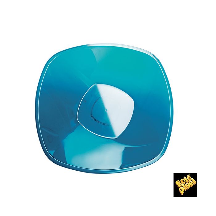Lot de 3 assiettes creuses en plastique de forme carrée et de couleur turquoise translucide, dimensions 21 x 21 cm.