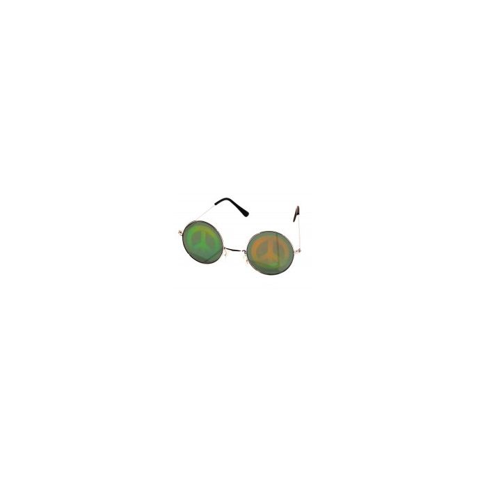 Nous vous proposons ces lunettes hologramme Peace and Love. Le sigle Peace and Love est le symbole du mouvement hippie. Ces lunettes ont les verres verts sur lesquels l'hologramme Peace and Love est apposé en orange et vert clair.