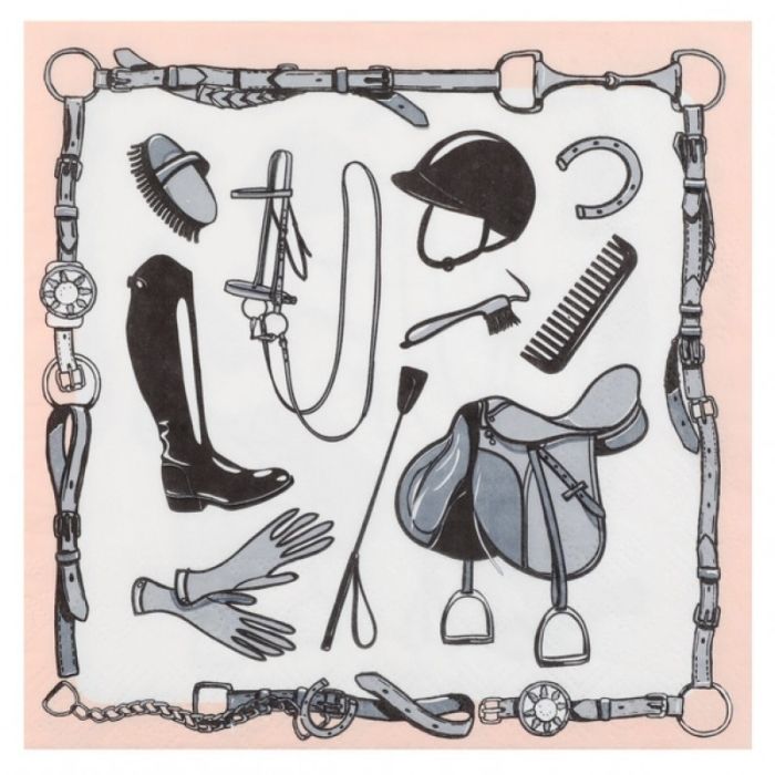 Ces serviettes en papier sont décorées des accessoires de cavalier, tel que les bottes, les gants, la selle. Elles sont vendues par lot de 20 et mesurent 16.5cm.